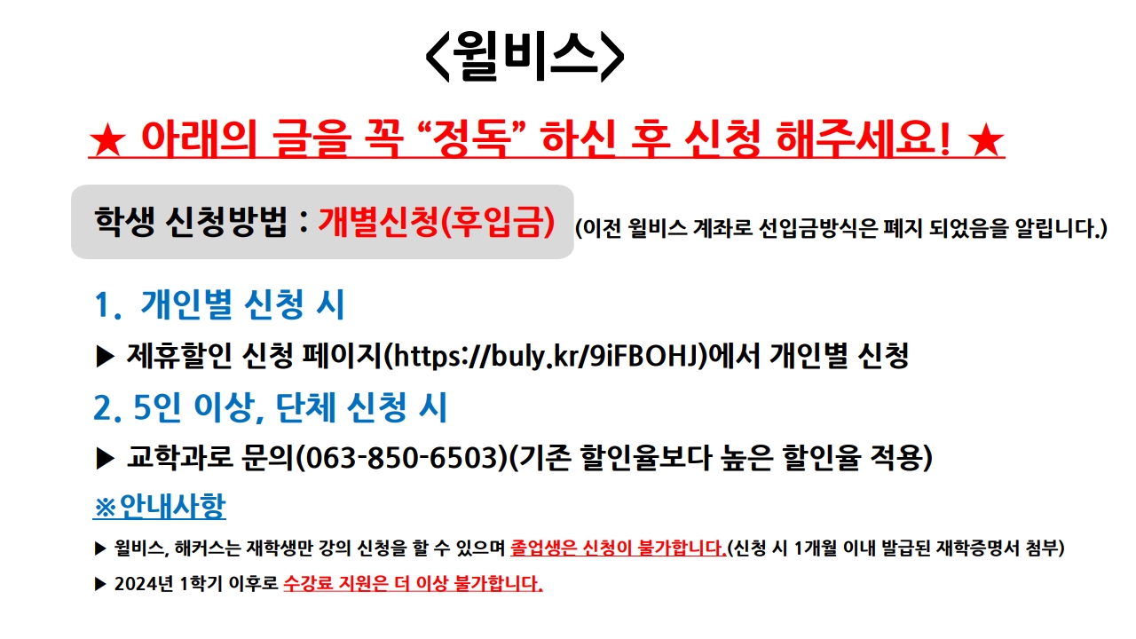 3. 단체 신청: 첨부된 신청서 양식을 작성하여 메일로 신청 (신청인의 재학증명서 첨부)